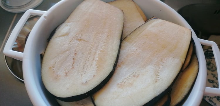 Tomen un bol grande, llénenlo de agua fría, pongan un puñado de sal y mezclen un poco para que se disuelva. Sumerjan las berenjenas.