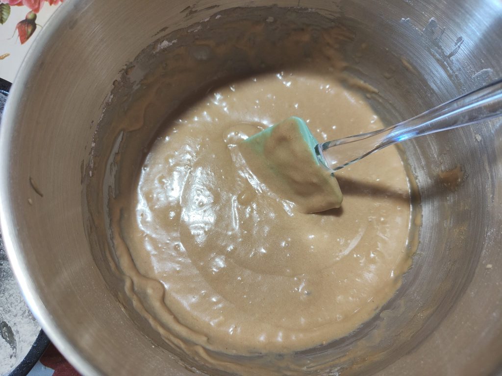 Cuando la mezcla esté clara, añade la mantequilla derretida y templada en hilo (o el aceite) y sigue trabajando para amalgamar.