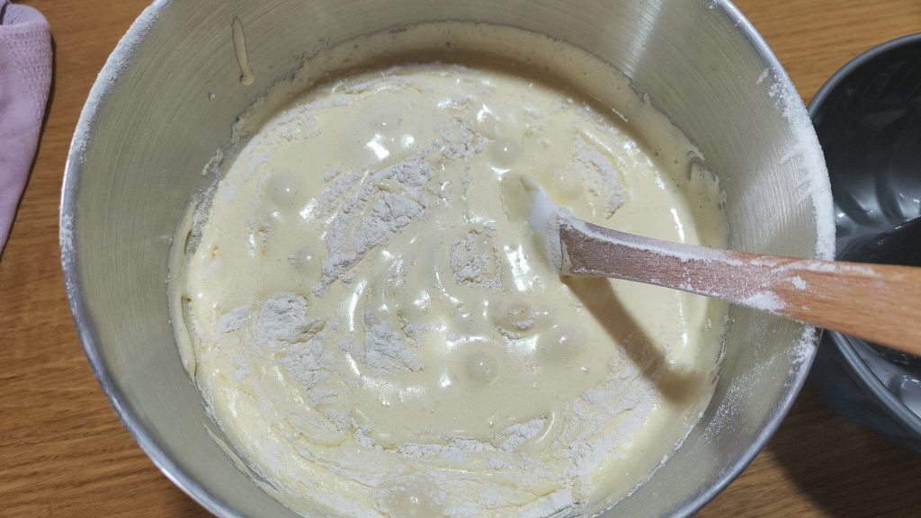 Añade la harina tamizada con la levadura poco a poco y mezcla de abajo hacia arriba siempre para no desmontar la mezcla.
