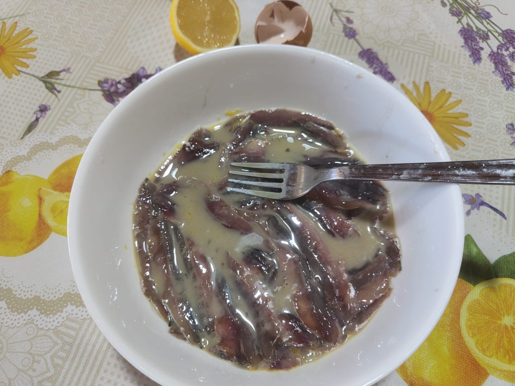 Tomamos los boquerones ya limpios, los ponemos en la mezcla de huevo y limón y dejamos marinar durante media hora.