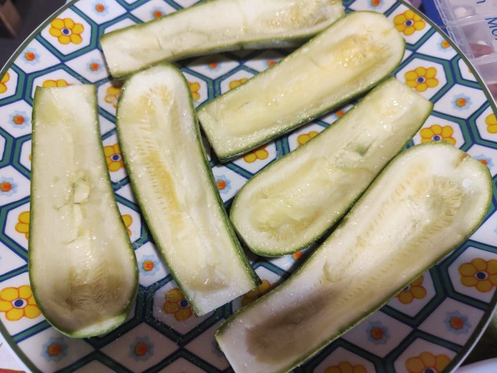Si no tienes el utensilio adecuado, puedes cortar la pulpa con un cuchillo y luego sacarla con una cucharilla. Intenta seleccionar calabacines del mismo tamaño para garantizar una cocción uniforme.