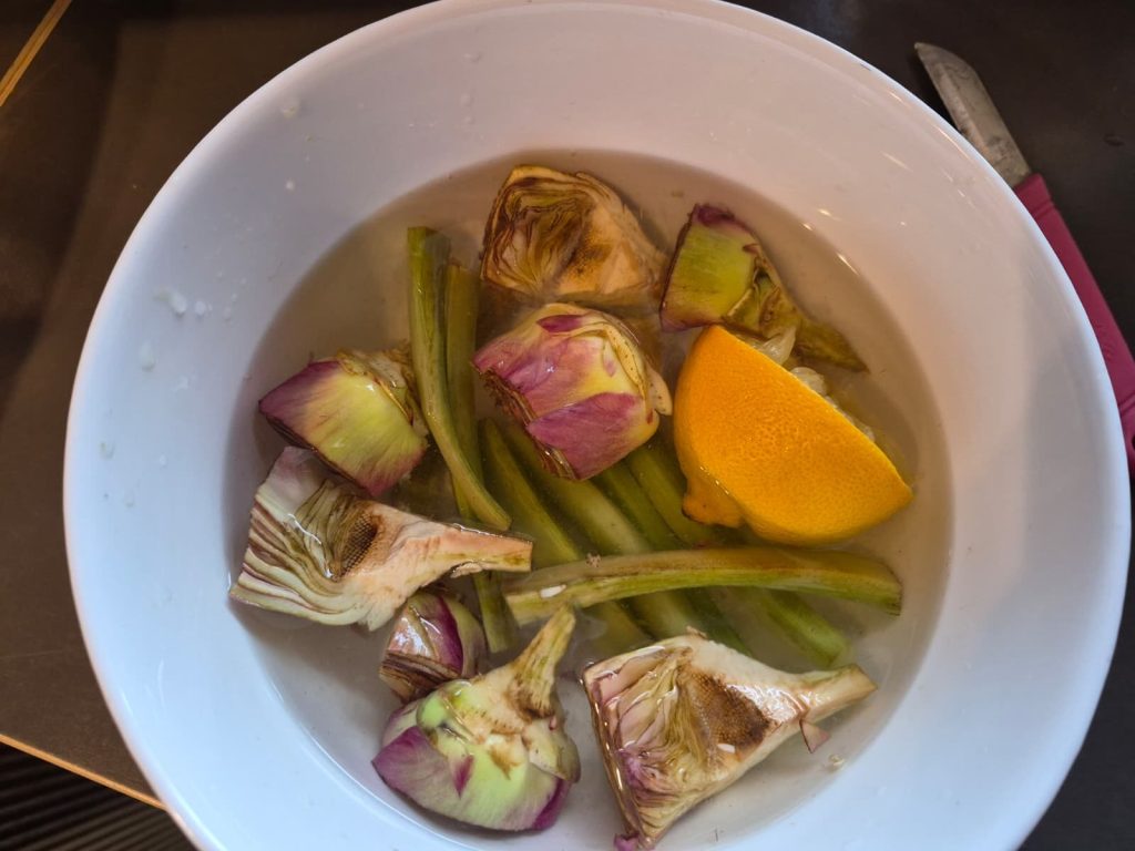 Prepara un bol con agua muy fría y el zumo de un limón. Si tienes cubitos de hielo, añádelos: el choque térmico deja la alcachofa increíblemente firme.