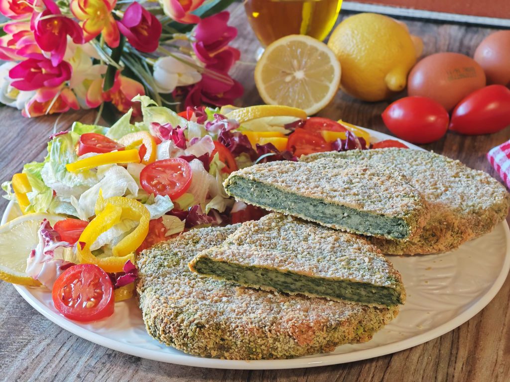 Chuletas de requesón y espinacas en freidora de aire. Son un segundo plato delicioso, fácil y rápido de preparar. Con poco gasto y gran rendimiento, ¡son buenísimas!