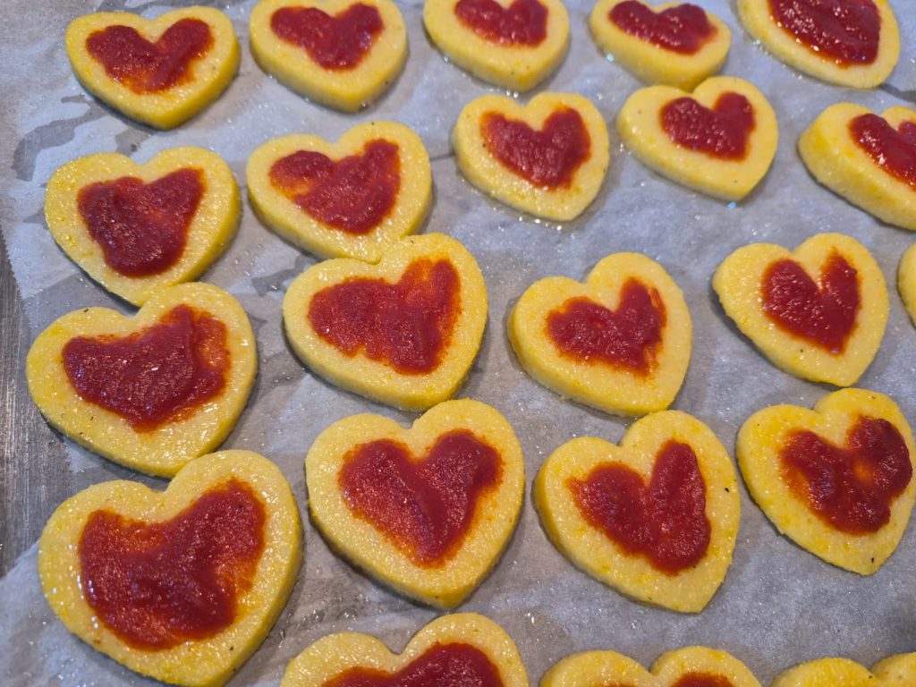 Puedes preparar la base de polenta y cortar los corazones incluso el día anterior, conservándolos en la nevera cubiertos con film transparente. Al momento de servir, solo tendrás que condimentarlos y hornearlos: ¡un truco excelente para no pasar demasiado tiempo en la cocina cuando tienes invitados!