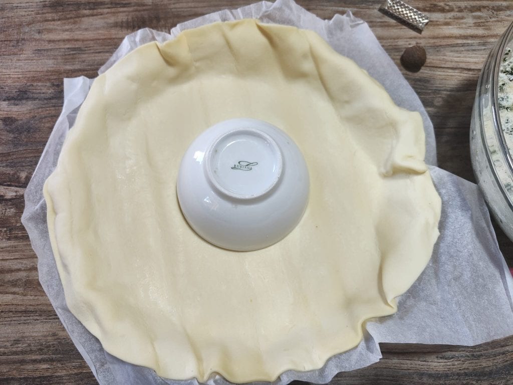 Extiende el rollo de masa de hojaldre sobre su papel de horno. Coloca en el centro un bol boca abajo y presiónalo ligeramente para marcar el disco central (te servirá como guía).
