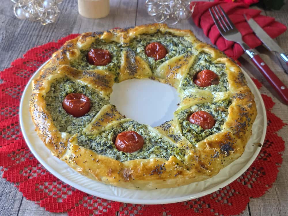 Corona de hojaldre con espinacas y ricotta. Un entrante fácil de preparar, sabroso y alegre, perfecto para embellecer las mesas en el periodo navideño pero no solo.