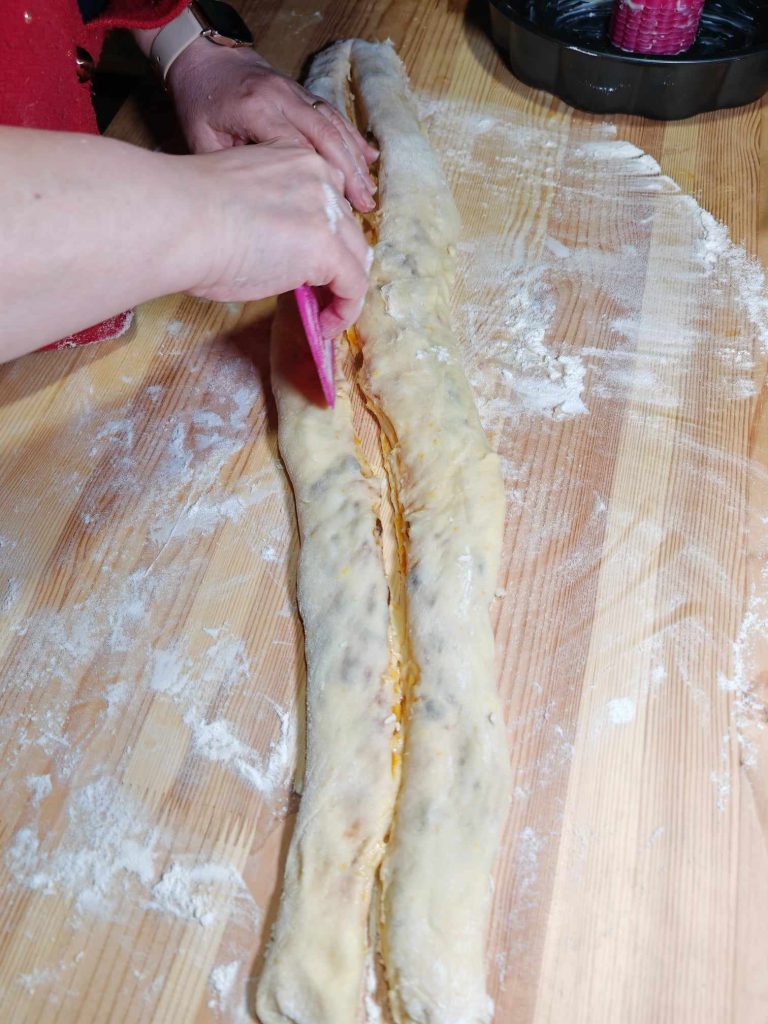 Abre las dos mitades con el lado cortado hacia arriba (para obtener el efecto hojaldre) y retuerce los dos cilindros, como una trenza, sin apretar demasiado.