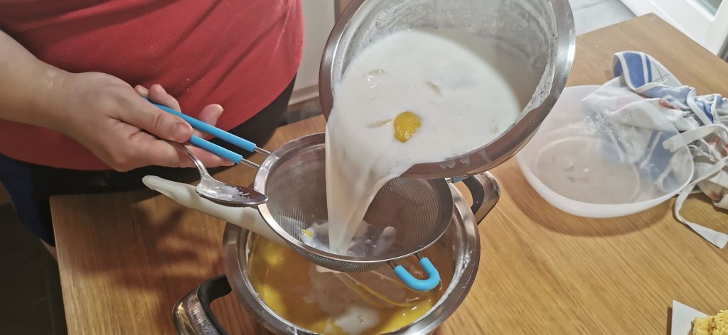 Templa la mezcla con un poco de leche vertida en un hilo fino. Para evitar que la cáscara de limón termine en la crema, utiliza un colador. Una vez añadido toda la leche, vuelve a poner la mezcla al fuego moderado.