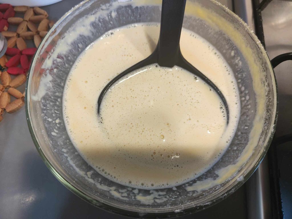 Diluid la mezcla añadiendo poco a poco la leche y continuando a mezclar hasta tener una masa fluida y completamente sin grumos.