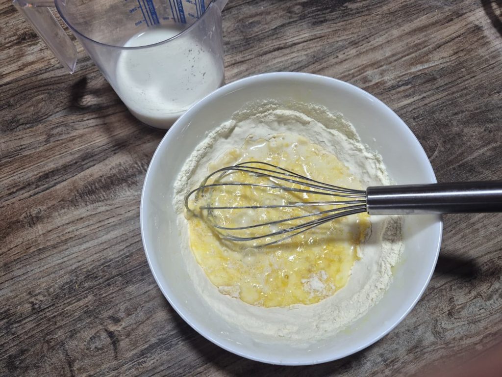 Batid ligeramente con unas varillas y agregad la harina 00 tamizada poco a poco, continuando de remover para evitar grumos.
