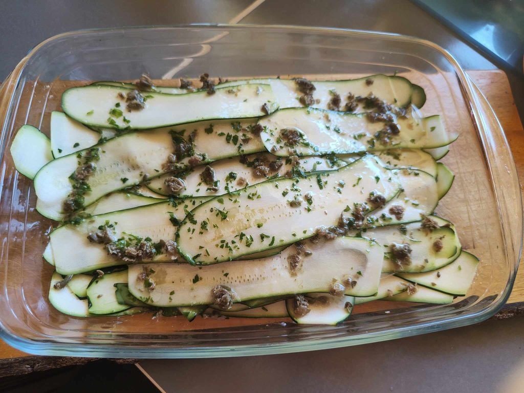 Realizad luego otra capa de calabacines y aderezadla con la marinada, continuad así hasta que hayáis agotado los ingredientes.