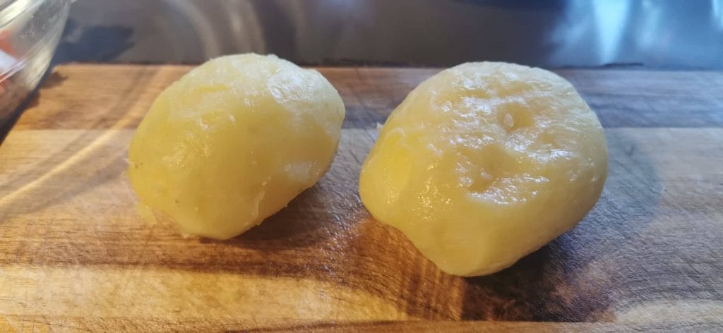 Lavar bien 4/5 patatas grandes y hervirlas con la piel, en agua con sal, durante unos 30/35 minutos desde el momento de la ebullición.