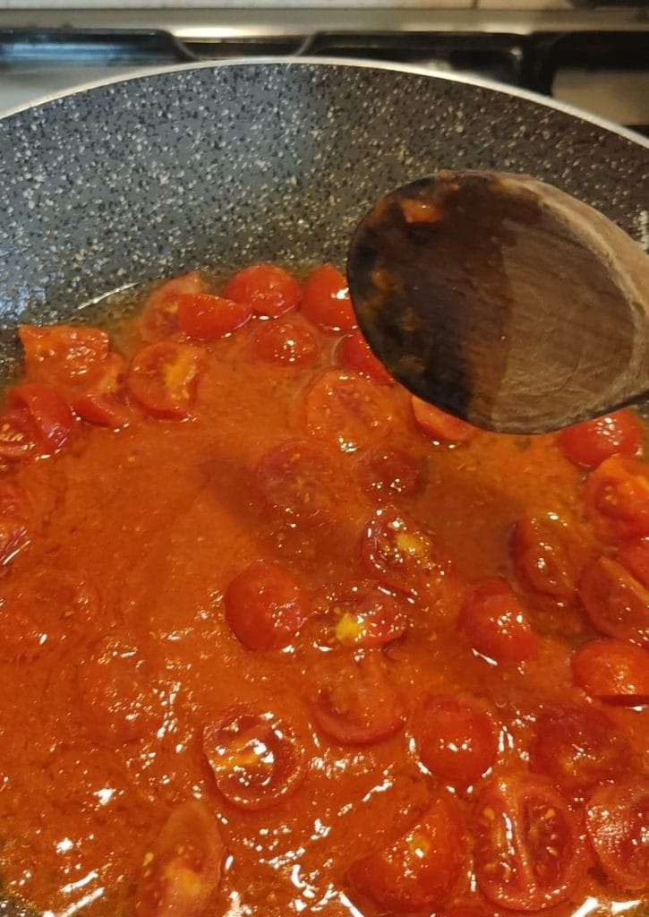 Mientras tanto, retomamos la sartén en la que hemos cocido la carne, vertemos el aceite con un diente de ajo y un poco de sal, luego añadimos los tomatitos cortados a la mitad y un poco de orégano y cocinamos por 5 minutos.