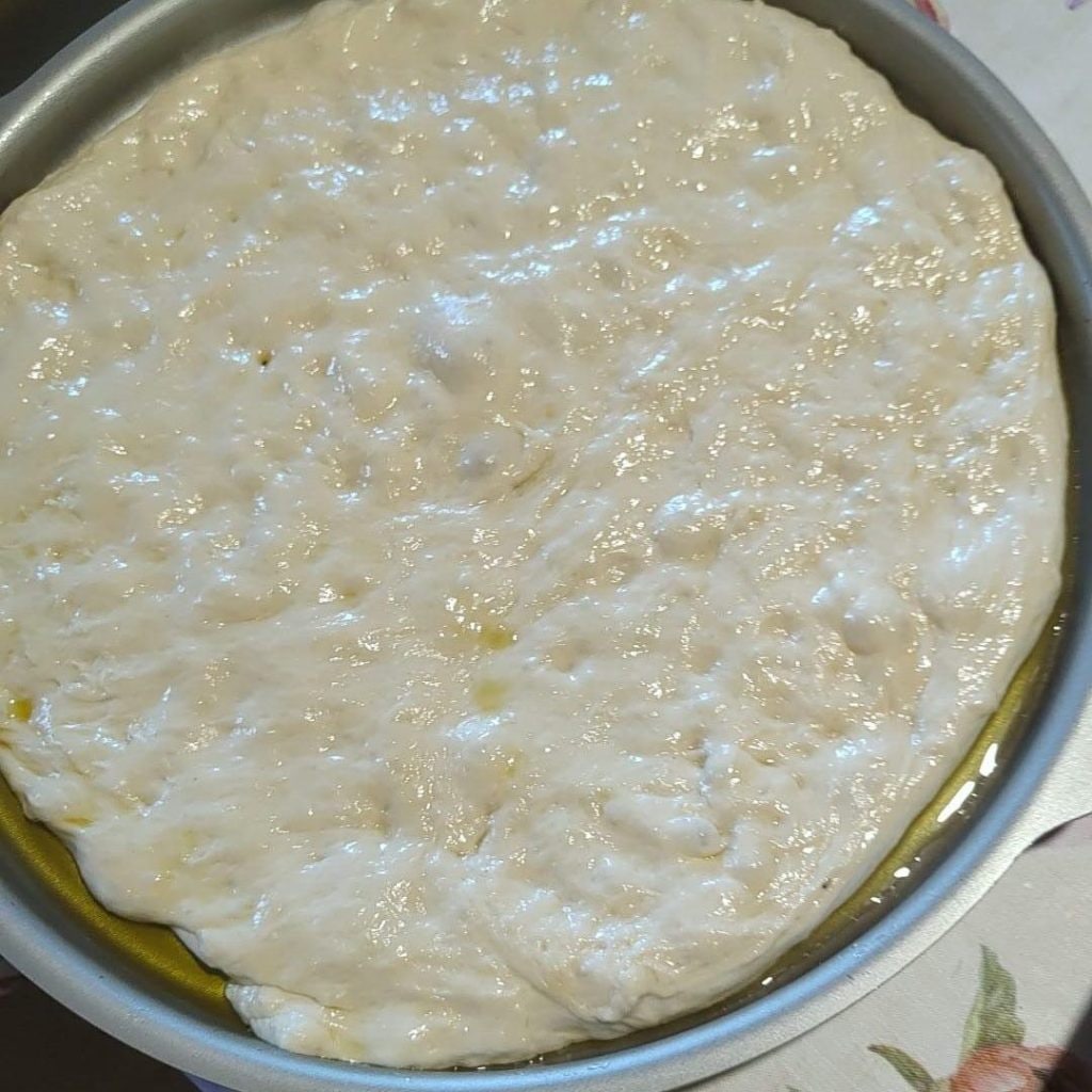 Distribúyela sobre la superficie de tu focaccia, hundiendo suavemente las yemas de los dedos, teniendo cuidado de no reventar las burbujas.
