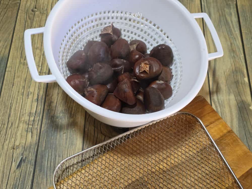 Mientras tanto, pon el agua a hervir en una cacerola en el fuego (este paso es útil si has decidido escaldar brevemente las castañas antes de la cocción en freidora de aire).