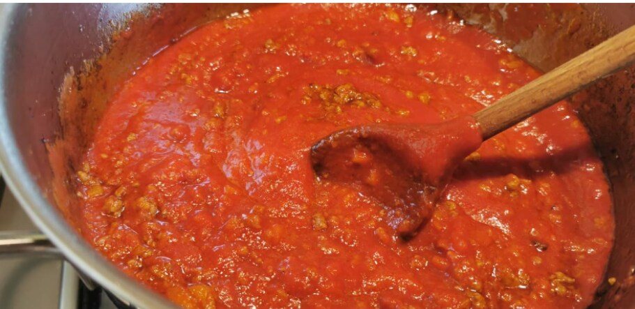 Dejad evaporar bien el alcohol y agregad la salsa de tomate, verted una cucharadita de sal y un poco de azúcar y coced a fuego bajo hasta que esté bien espeso.