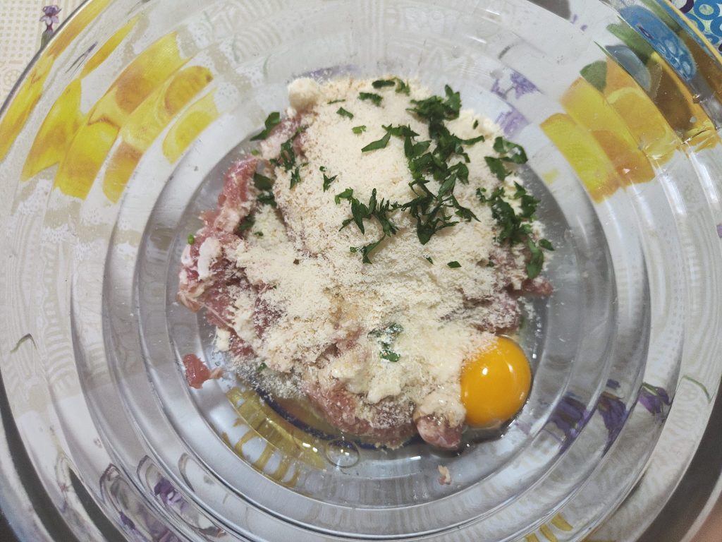 Añade la carne, la salchicha, los huevos, el parmesano, la sal y la pimienta y la nuez moscada.