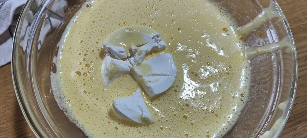 Luego se añade la ricotta fresca, los huevos y el azúcar, obteniendo así una mezcla densa y cremosa.