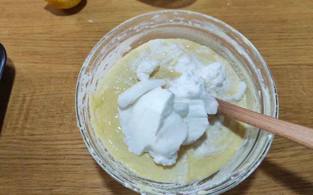Una vez que la clara se ha amalgamado bien, añadid el resto de la clara y mezclad de abajo hacia arriba.