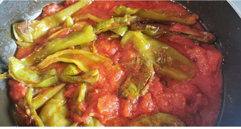 A mitad de cocción, añadir los pimientos fritos previamente cocidos, mezclar para amalgamar los sabores, probar y cubrir con una tapa y bajar el fuego.