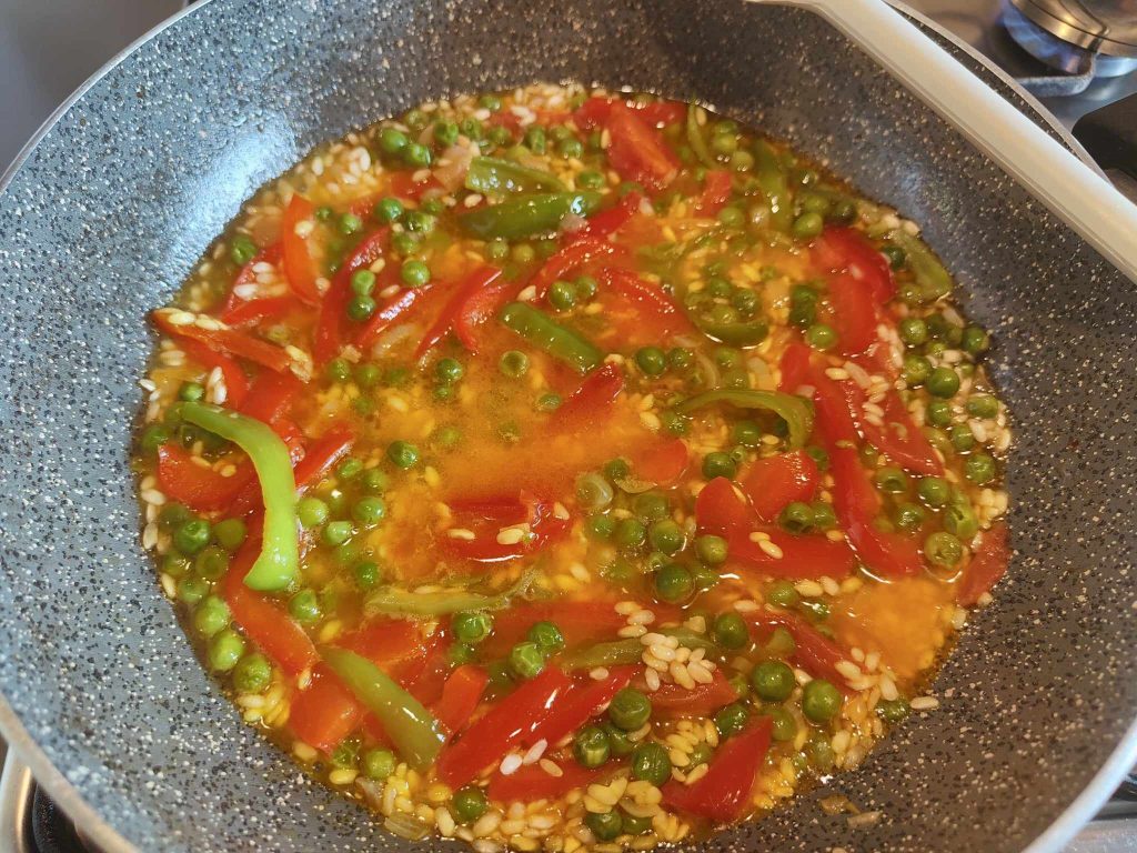 Para la cocción de la paella, se deberá evaluar la cantidad de caldo a verter. Necesitarás aproximadamente 4 veces de caldo por 1 de arroz.