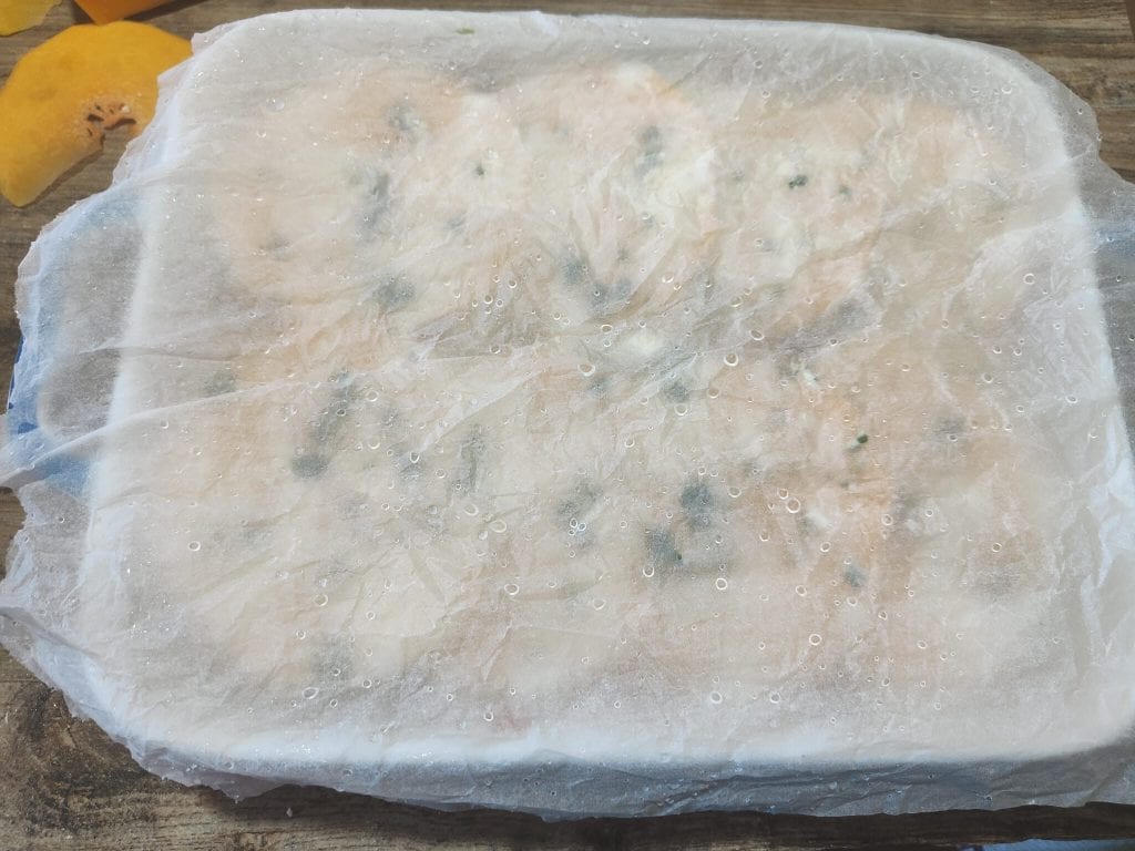 • Coloca una capa uniforme de rodajas de calabaza enharinadas en el fondo de la fuente.