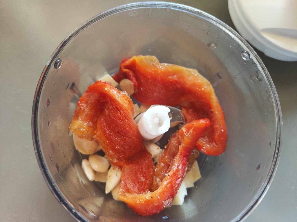 Licuar todo hasta obtener un pesto de pimientos suave y homogéneo.
