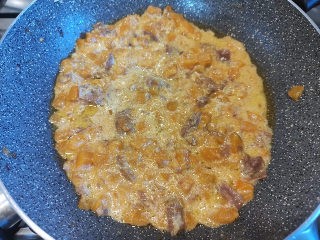 Cuando la calabaza cocina (Paso 1), si ves que el caldo se evapora demasiado rápido y la calabaza no está todavía muy suave, puedes añadir medio cucharón de agua de cocción de la pasta.