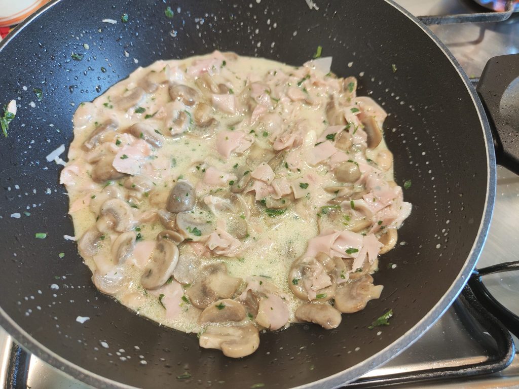 • Excelente. ¡La pasta con champiñones y jamón está lista para ser disfrutada en toda su bondad!