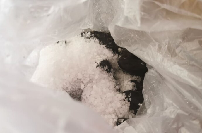 (Introduce algunos mejillones en una bolsa de plástico, añade abundante sal gruesa y ciérrala. introduce la bolsa cerrada en otra bolsa.