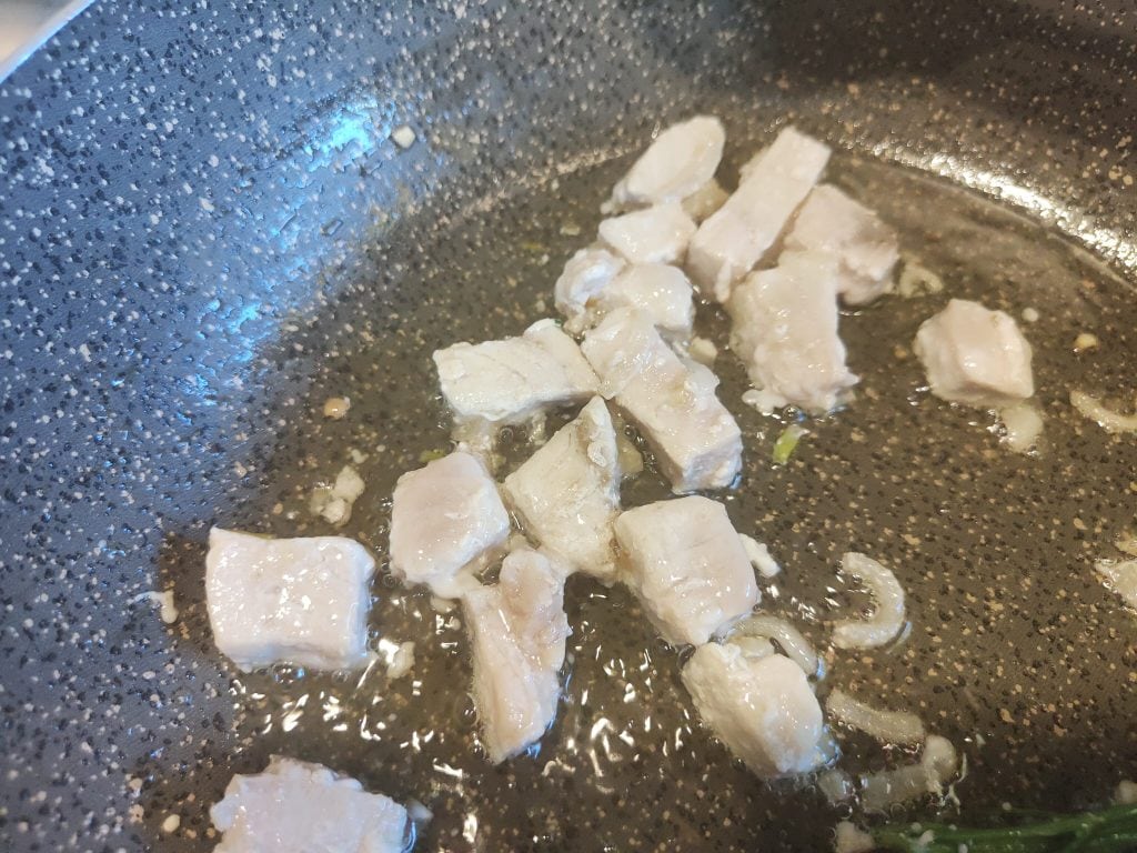 Mientras tanto, limpiamos el pez espada, quitamos la piel y las espinas y lo cortamos en cubitos de aproximadamente 1,5 cm por lado.