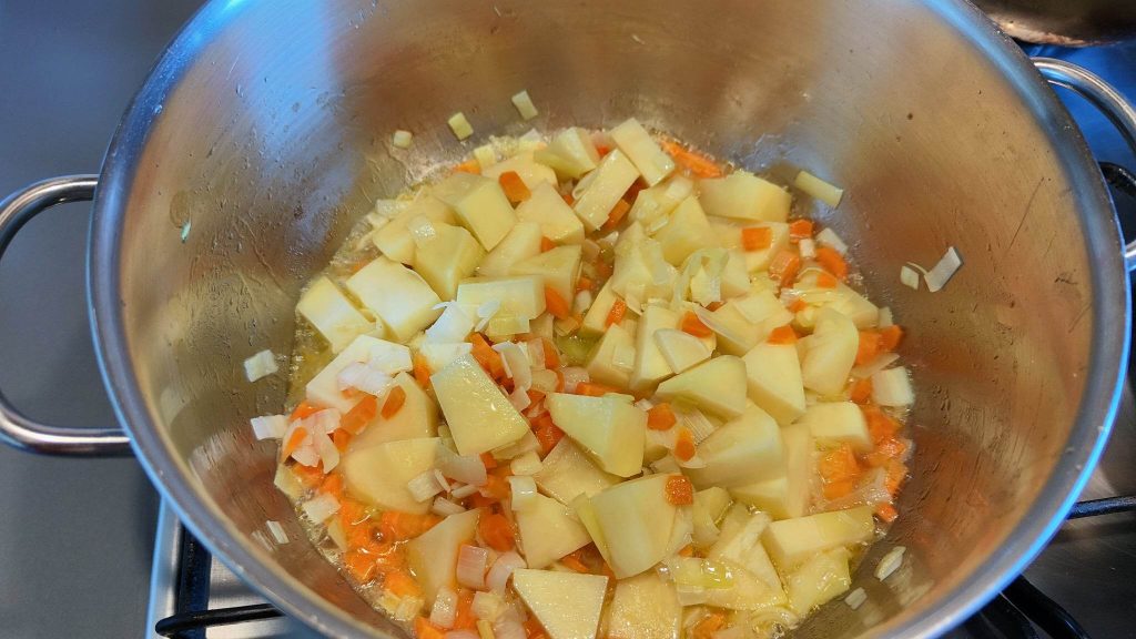 La he definido humilde pero rica porque está compuesta de ingredientes simples y humildes como el puerro, los guisantes, las patatas y las zanahorias, pero es rica en sabor.