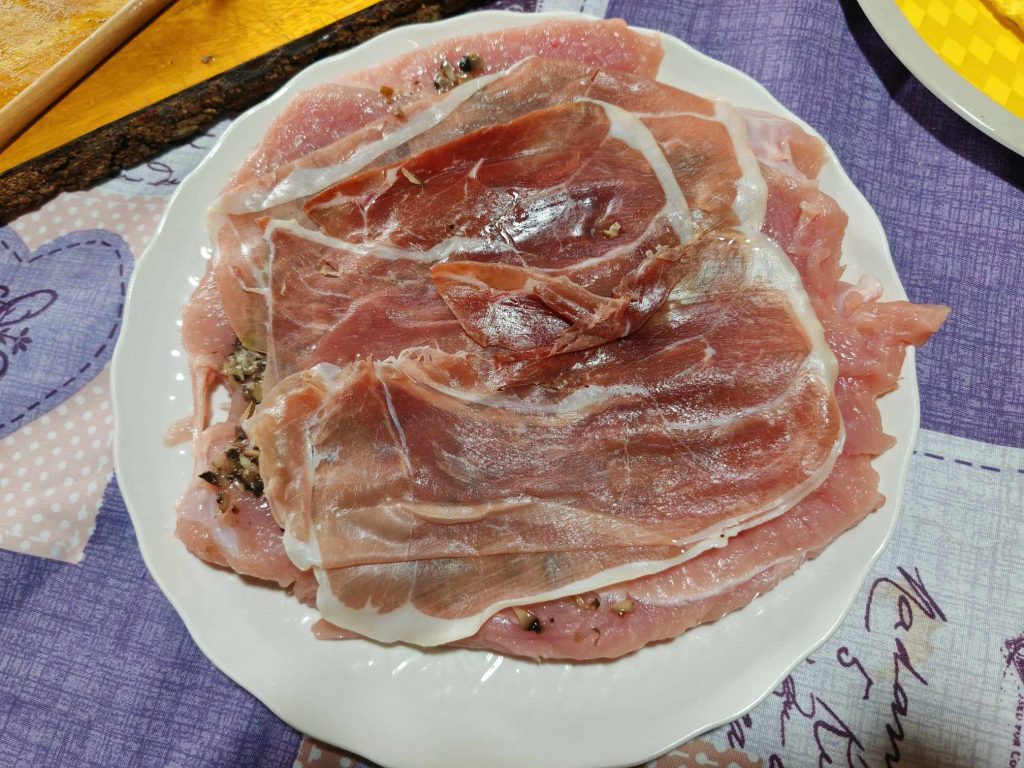 No es más que un asado enrollado relleno de delicias: entre la carne blanca se ocultan de hecho jamón, champiñones y tortilla de huevos y queso rallado.