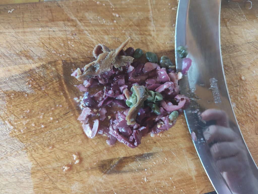 Pica finamente las alcaparras, las aceitunas y las anchoas.