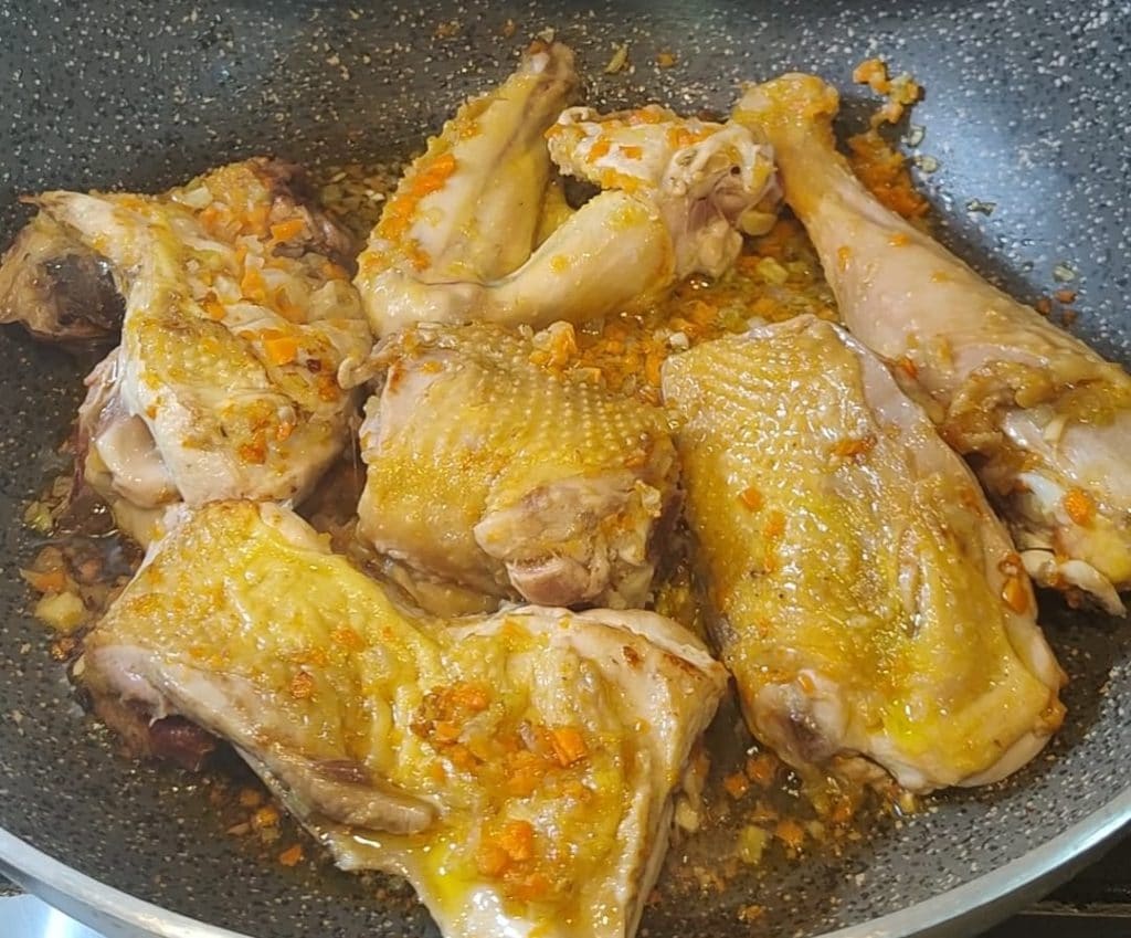 • Coloca los trozos de pollo directamente sobre las cebollas, sube el fuego y doralos por todos lados. Una vez bien dorados, tapa la olla, baja el fuego al mínimo y continúa la cocción durante unos 40/45 minutos, girando la carne de vez en cuando.