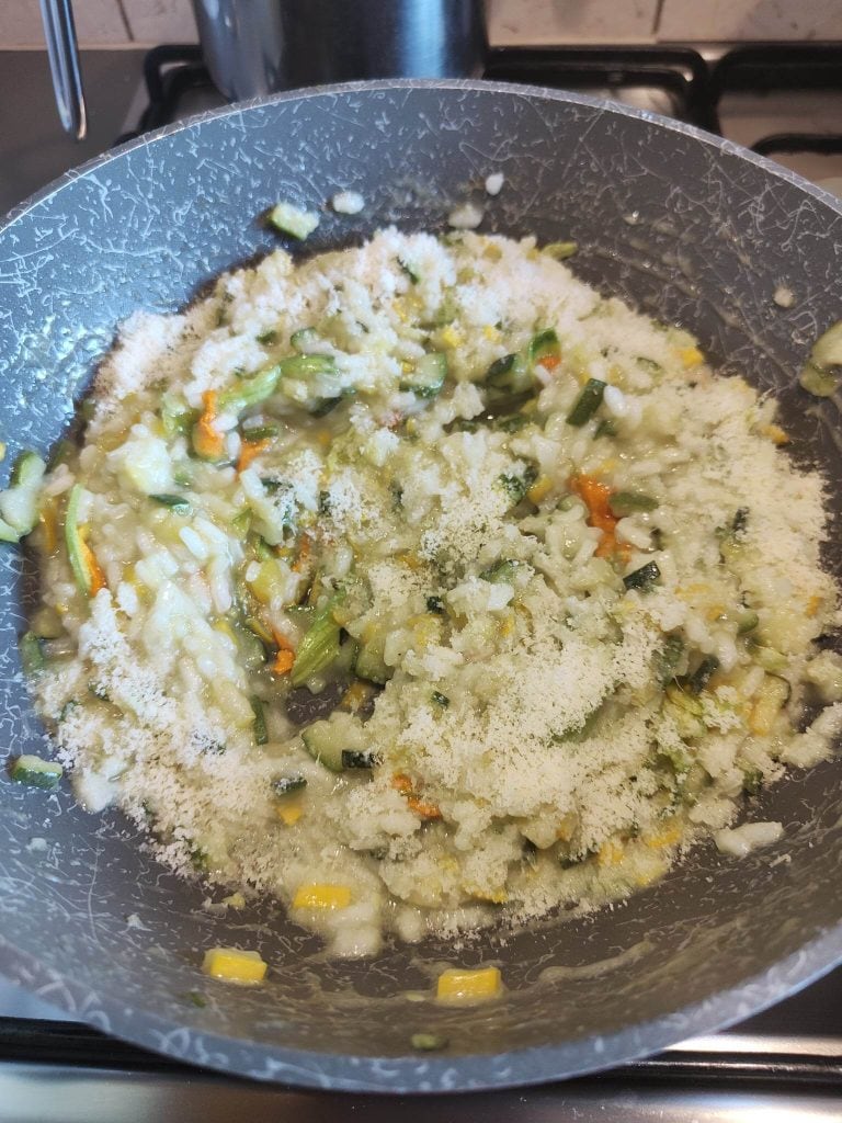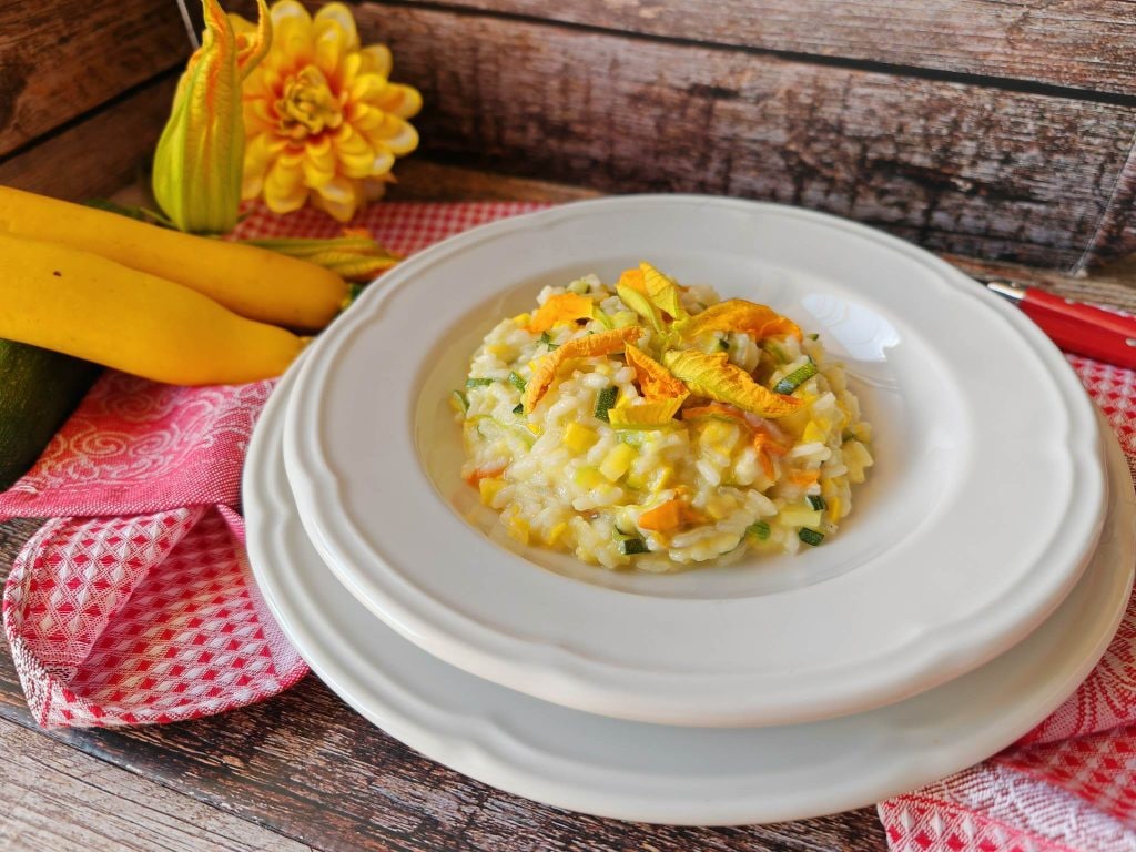 Aquí tienes la receta de hoy: el risotto con flores de calabacín y calabacines. Realmente bueno, delicado, ligero y sano.