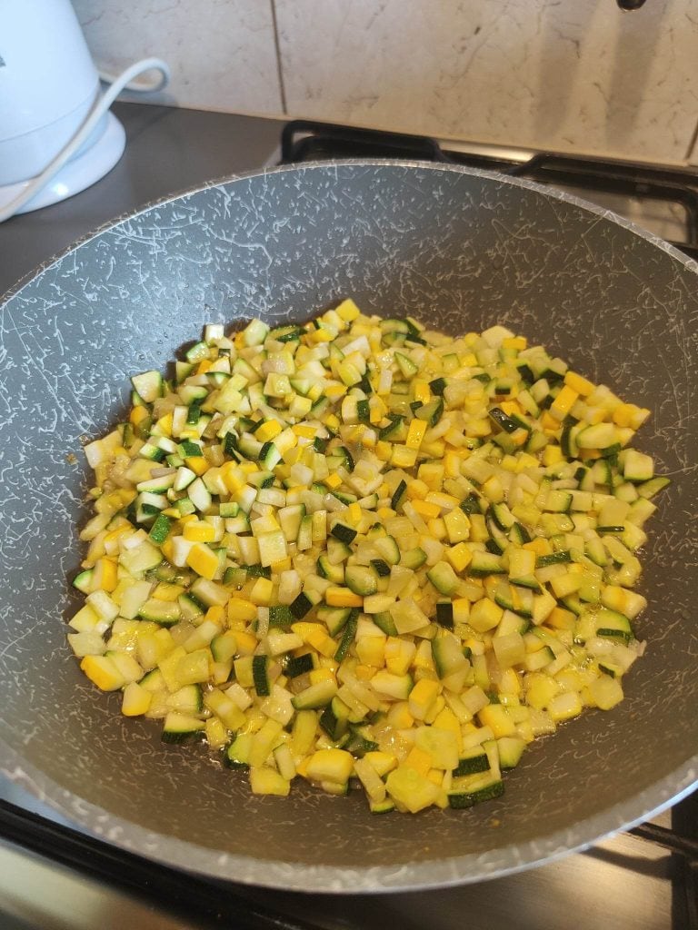 Dejamos dorar, luego añadimos los calabacines cortados y dejamos cocinar durante unos 5 minutos.