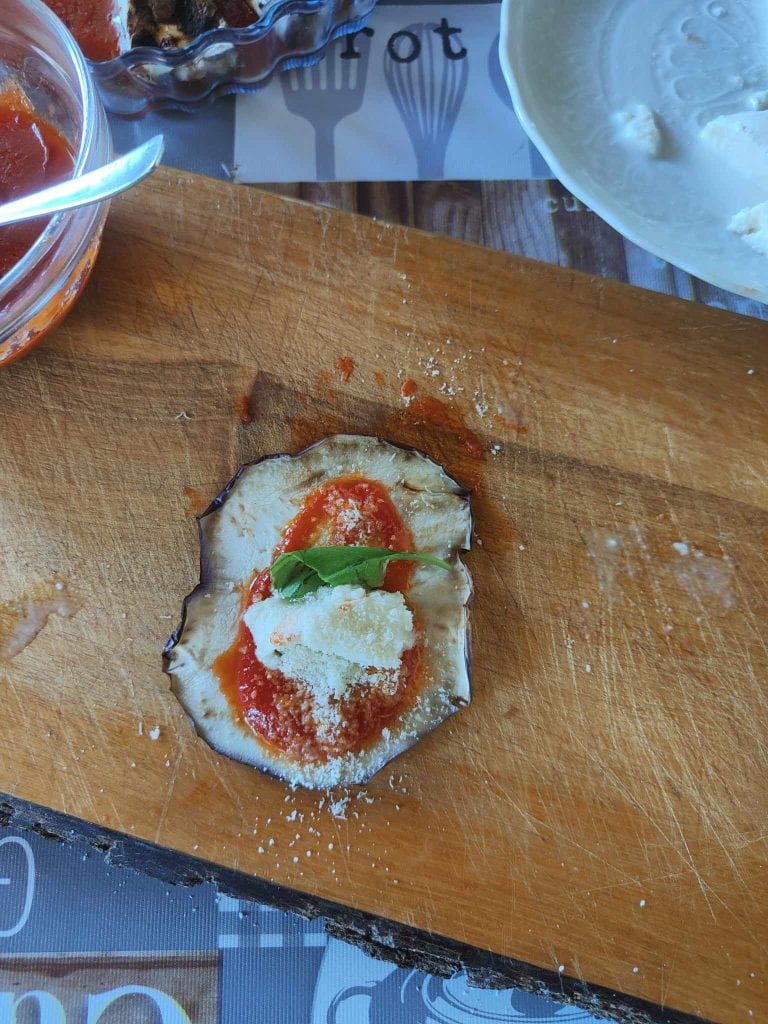 • En una superficie, extender las rodajas de berenjena y untar un poco de salsa, colocar en la base un trozo de mozzarella (que no sea muy pequeño) y una hoja de albahaca y una generosa pizca de queso rallado.