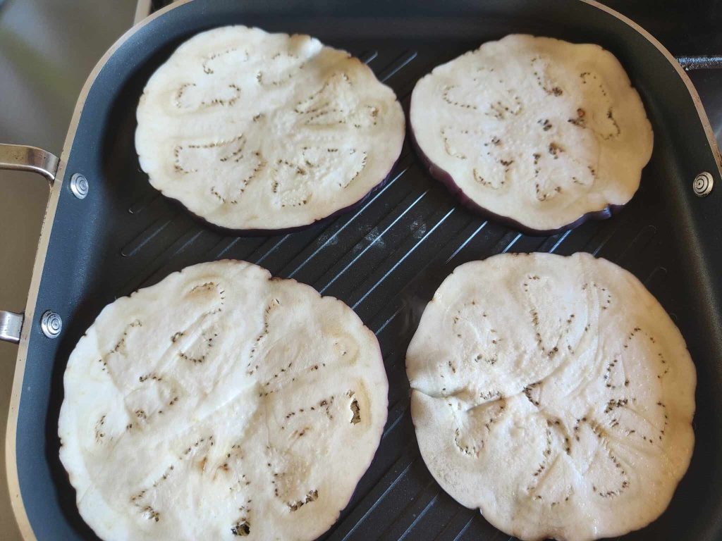 Asar las berenjenas bien por ambos lados. Una vez cocidas, transferirlas a un plato y proceder con la formación de los rollitos.