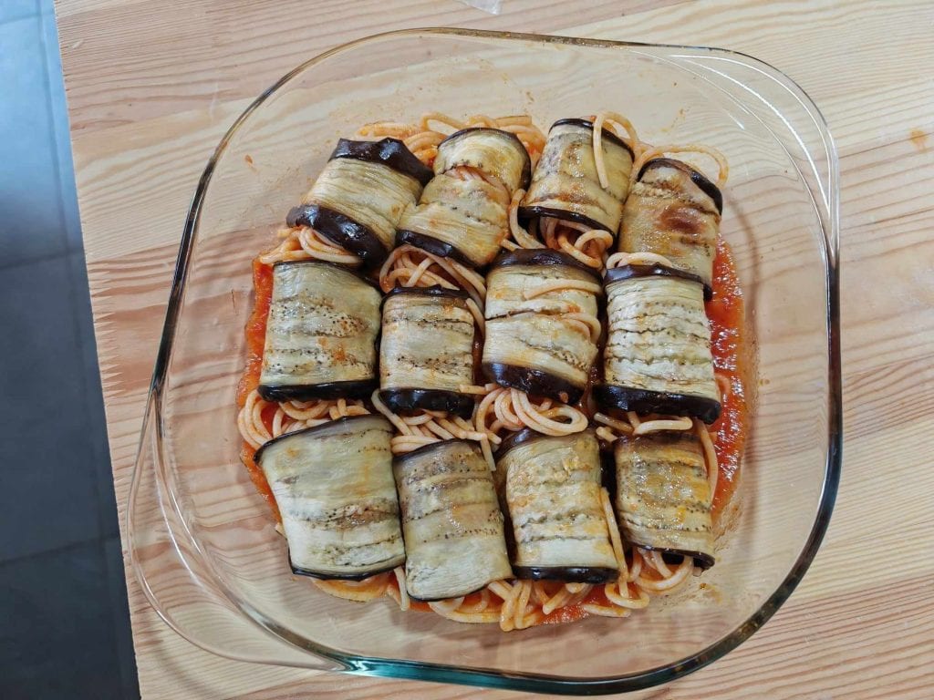Rollitos de berenjena con espaguetis a mi manera. Un plato increíble de esos que no se olvidan fácilmente.