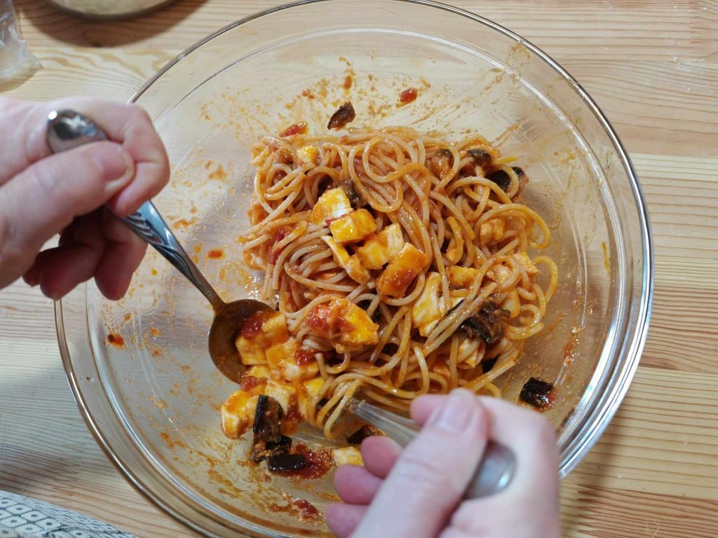 Bastará con cocinar las berenjenas (decidís vosotros si a la parrilla, fritas o al horno) y rellenarlas con la pasta condimentada con salsa de tomate, albahaca y mucha mozzarella.
