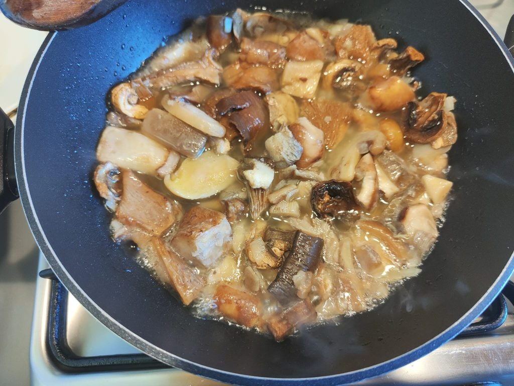 Cuando los champiñones estén cocidos, ajustar de sal y retirar del fuego.(Si utilizáis champiñones congelados, recomiendo después de la cocción cortarlos un poco con el cuchillo de mezza luna).