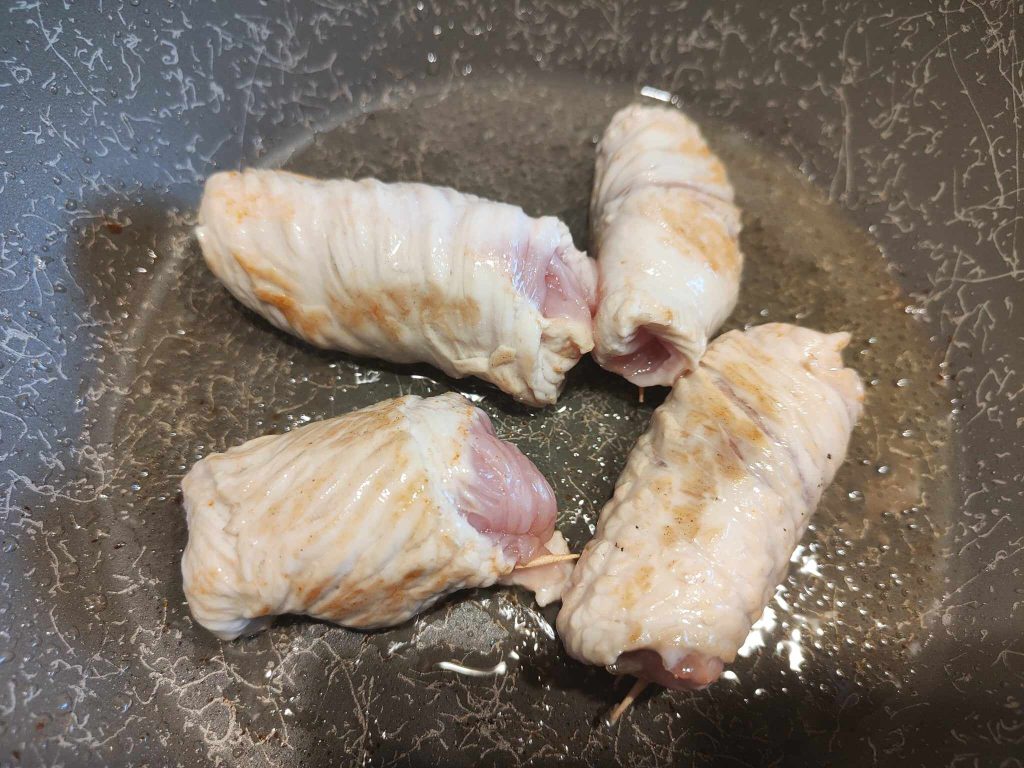 Colocar sobre cada filete de pavo un poco de jamón cocido y un bastoncito de queso, enrollar la carne formando el rollito y asegurar con palillos.