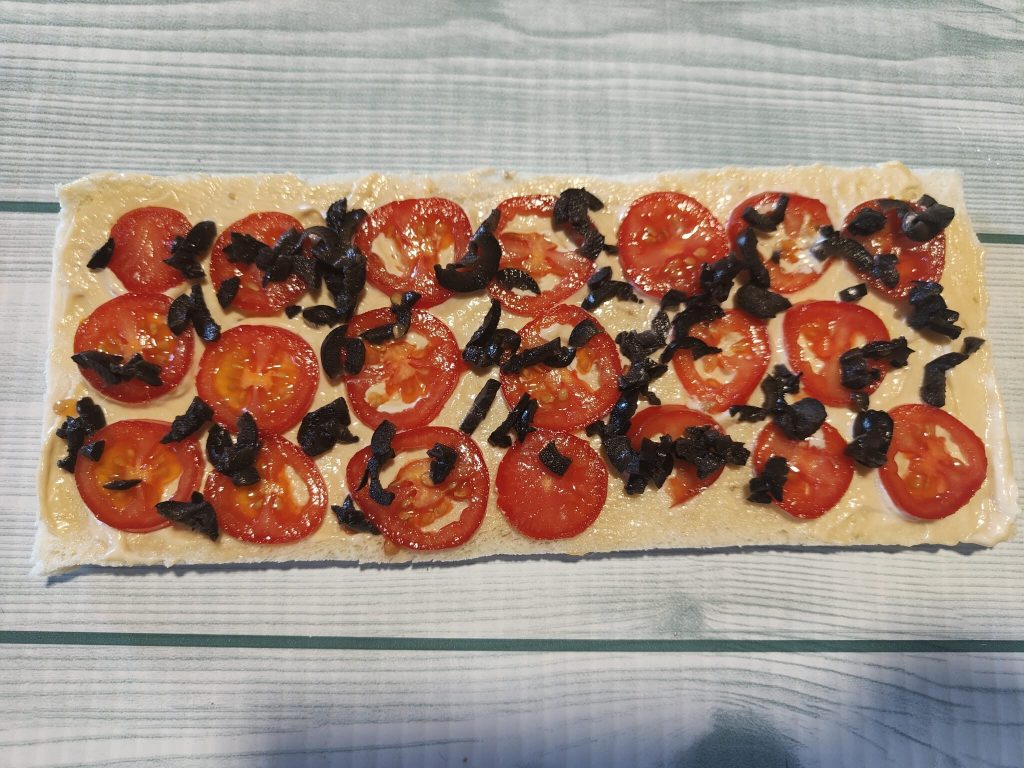 Colocamos luego las rodajas de tomatitos y aceitunas negras cortadas finamente y enrollamos, luego envolvemos en el film y dejamos reposar en la nevera durante 30 minutos.