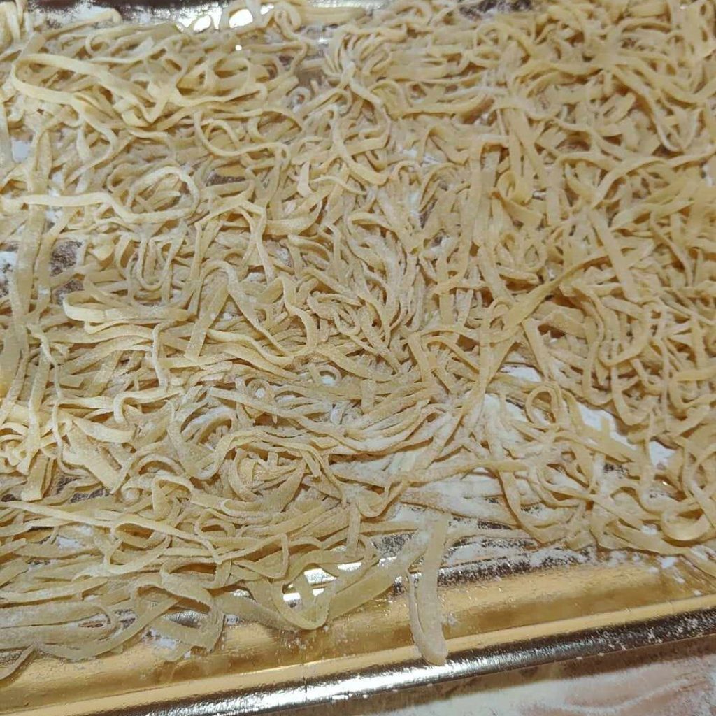 Ayer había amasado los tagliolini frescos y usé esos, pero con este condimento va bien la pasta que prefieras, larga, corta, fresca o seca, el resultado no cambia y siempre buenísimo.
