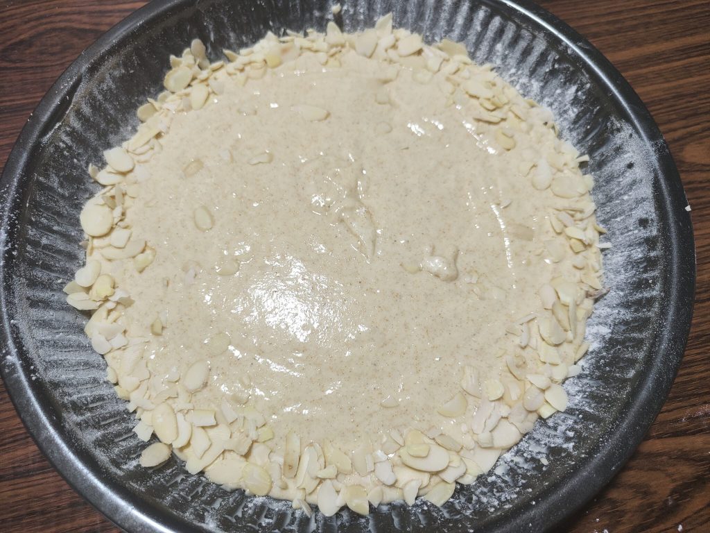 (La precocción las hará más suaves y dulces, además de evitar que se hundan completamente en la mezcla.)Decoralos bordes de la tarta con las láminas de almendra. Esto le dará un toque crujiente y un aspecto más profesional al dulce.