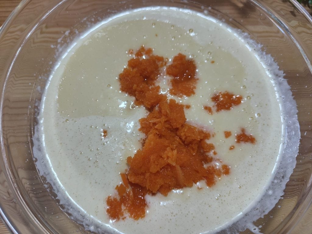Incorpora el puré de calabaza y zanahoria y mezcla todo bien bajando la velocidad de la batidora.