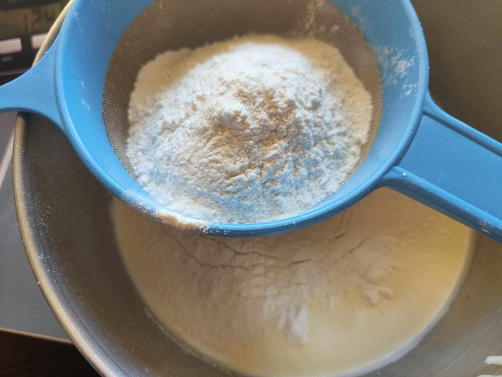 Unir la bolsita de vainillina, la harina y la levadura tamizadas, en cucharadas, en varias veces, añadir una pizca de sal.