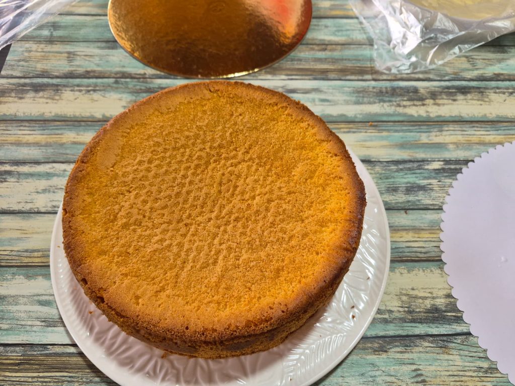 Una vez frío, recorta con cuidado los bordes exteriores del bizcocho con un cuchillo de sierra para eliminar la corteza oscura y nivelar la forma.