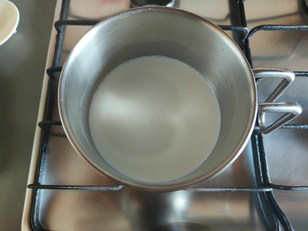 Luego, vierte el contenido del bol en el cazo con la leche caliente restante y pon de nuevo al fuego para espesar. Remover siempre para que no se pegue.